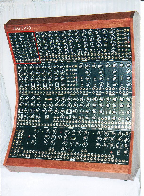 The top position of the second switch is the STEP mode. In this mode, the UEG takes on a whole different personality: it becomes a step sequencer! It will advance through the 8 stages for each positive pulse on the GATE input. The START and END loop switches allow the UEG to start a "loop" anywhere from stages 2 through 4, and end the loop between stages 5 and 7. These are used in LOOPONLY mode and in GATED mode. The output waveform can have one of three slopes: linear, log, and step. These are shown graphically on the front panel. The UEG also has a MANUAL GATE button, useful to trigger the UEG while setting it up. The four 1/4" jacks along the bottom are the two inputs and two outputs. The leftmost jack is the GATE input and it requires a fairly clean pulse or squarewave input. (A Triangle wave will also work, but it needs to be fairly fast.) The next jack is the TCV, or Time Control Voltage input. A 0 to 5 volt input will modulate all the time values to greater values. The OUT jack is the main output waveform. It is a 0 to 5 volt analog voltage that corresponds to the front panel settings. The TRIGOUT jack is the rightmost output and will fire off a short pulse at the conclusion of stage 8. It it also a 0 to 5 volt signal. This is useful to trigger other events in a MOTM system. For example, it could be used to trigger a second UEG to behave as a 16 stage sequence or envelope. New feature: In LFO mode the TRIGOUT can output a pulse for each stage of the LFO or at the end of the LFO cycle. All current users can have this update at no charge if they send us their UEG postage page both ways. To see the UEG in a user's system, click here: "Synth of Doom" which is owned by Dave Bradley. Check out more MOTM fun at Dave's site:Dave Bradley's Hot Rod MOTM shop The next two links/descriptions are UEG specific demos created by Robert Rich. Faster version of above with more dynamic filter tweaks. The user's manual can be downloaded by clicking here |